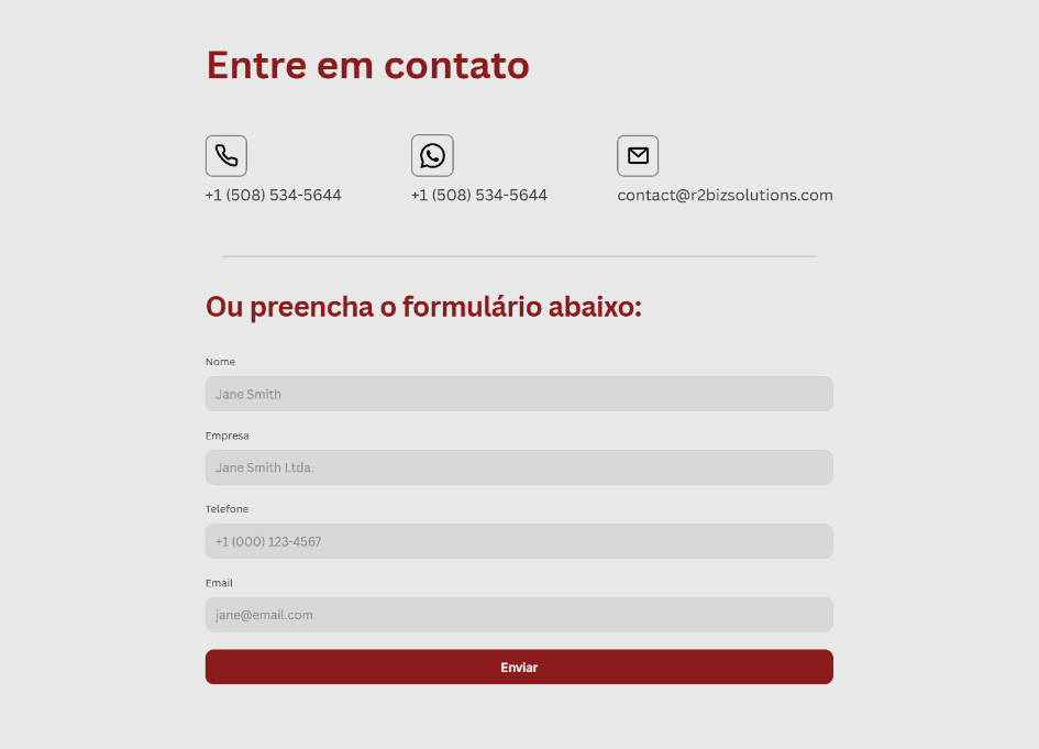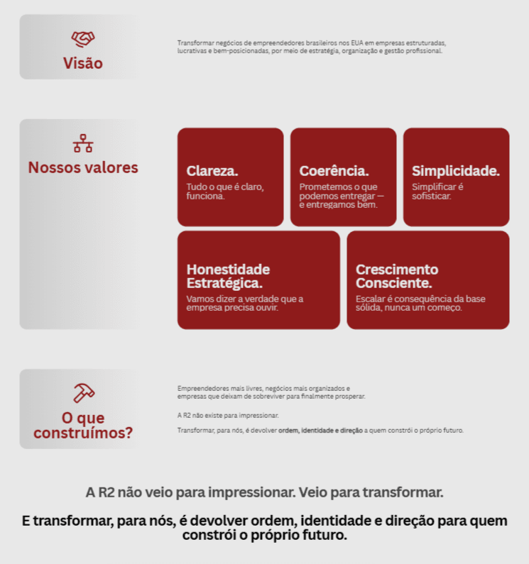 A R2 Business Solutions é uma empresa que fornece consultoria e mentoria para empreendedores brasileiros nos Estados Unidos. Fui contratada para dar vida ao site da empresa, que serviria como o principal convite ao público a adquirir seus serviços.